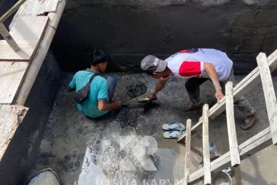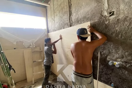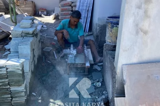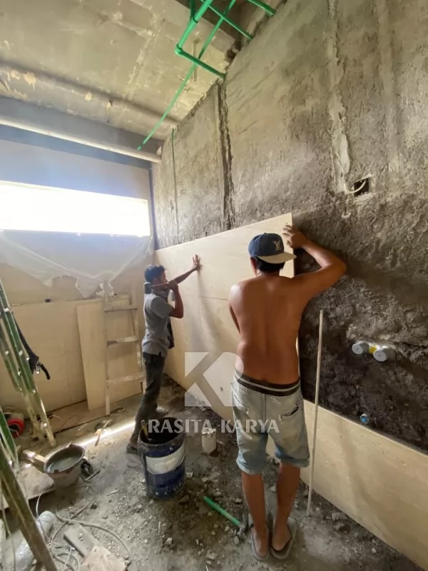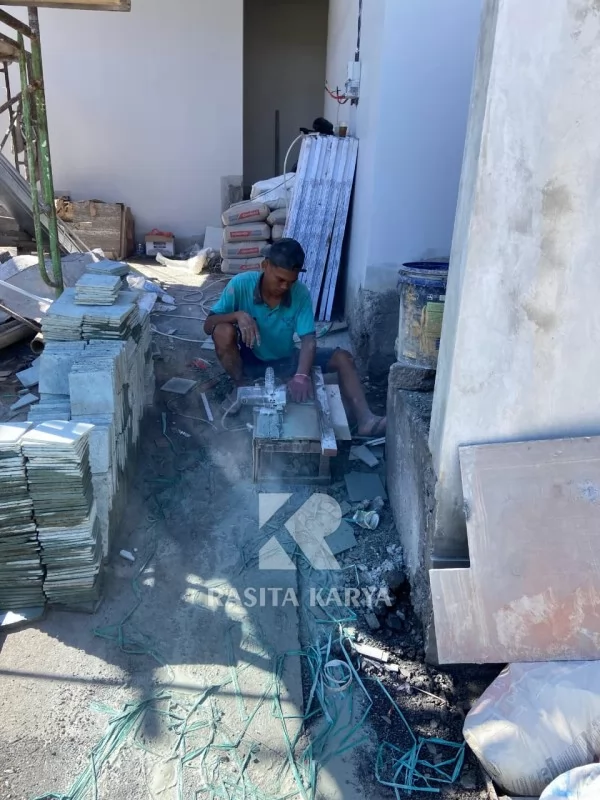 Pembangunan Villa M di Seminyak Kuta: plint keramik, acian pada atas list u plint keramik