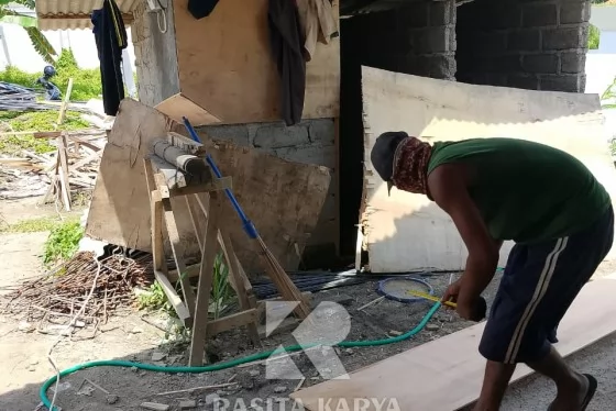 Pembangunan Rumah di Ketewel: pelepasan begesting, Plesteran aci tembok luar bangunan, Pemasangan kabel dan pipa pembuangan air hujan