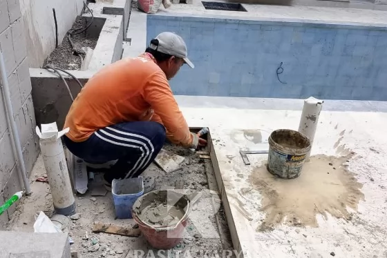 Pembangunan Villa di Jimbaran, Kuta Selatan: bekisting angkul2 pasang keramik dinding kamar mandi dan pemasangan batu hijau kolam