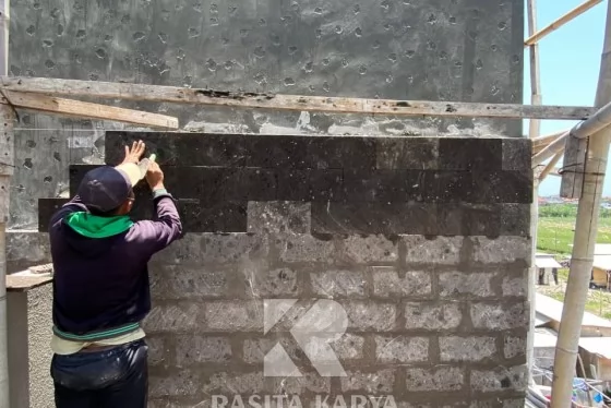 Pembangunan Villa di Jimbaran, Kuta Selatan: pemasangan batu sukabumi kolam renang